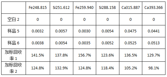 从加标回收率数据可知,铁和钙的数据均在范围内,硅的干扰较大,可能是实验稀释和转移过程中,引入了杂质,造成回收率偏高。